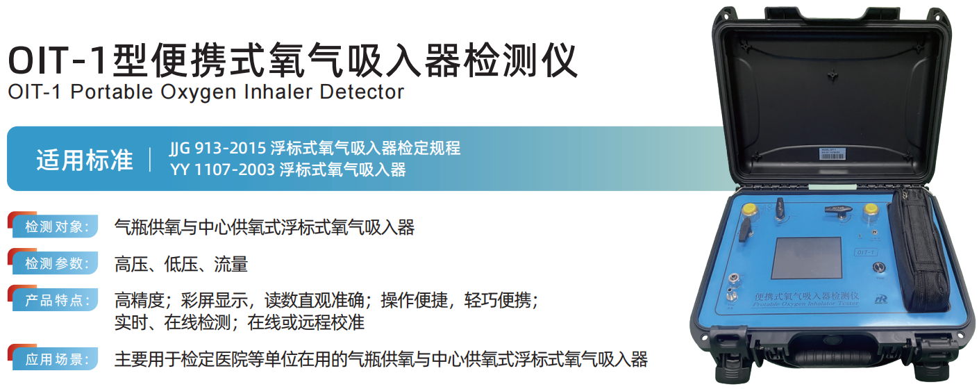 OIT-1型便携式氧气吸入器检测仪由南京明瑞检测技术有限公司研制,主要用于检定医院等单位在用的气瓶供氧与中心供氧式浮标式氧气吸入器的流量、高压、低压部分。