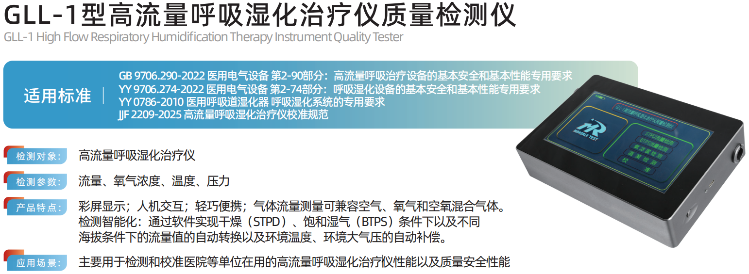 GLL-1型高流量呼吸湿化治疗仪质量检测仪是南京明瑞检测技术有限公司研制,依据国家标准和行业标准设定采集次数,自动完成高流量呼吸湿化治疗仪的传输气体流量、传输氧气浓度、传输气体温度等数据的采集和校准。采用无线数据传输方式,以及功能强大的数据处理软件实现智能化检测,大大提高工作效率。该质量检测仪体积小,彩色触摸屏显示,操作便捷可靠。
