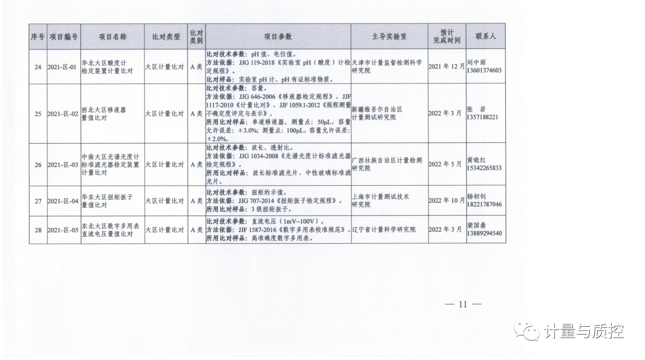 (三)2021年由大区国家计量测试中心组织的大区计量比对项目,包括华北大区酸度计检定装置计量比对、西北大区移液器量值比对、中南大区光谱光度计标准滤光器检定装置计量比对、华东大区扭矩扳子量值比对、东北大区数字多用表直流电压量值比对等5项(见附件)。有关计量技术机构按照大区管理规定参加。