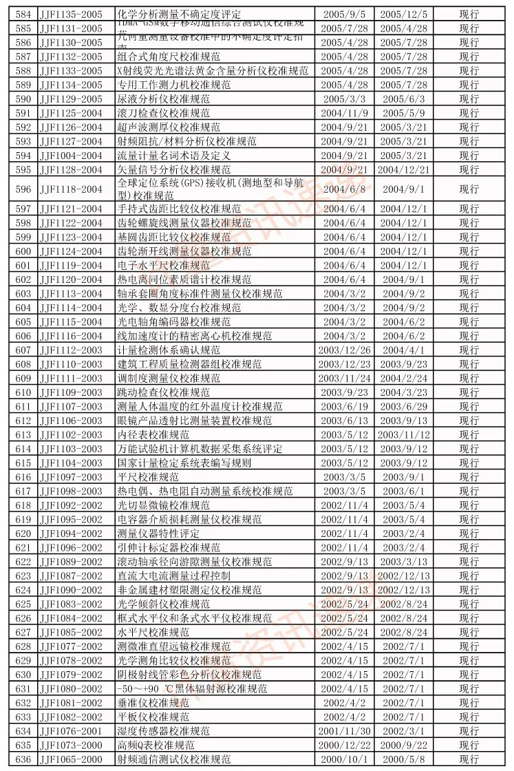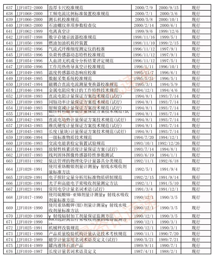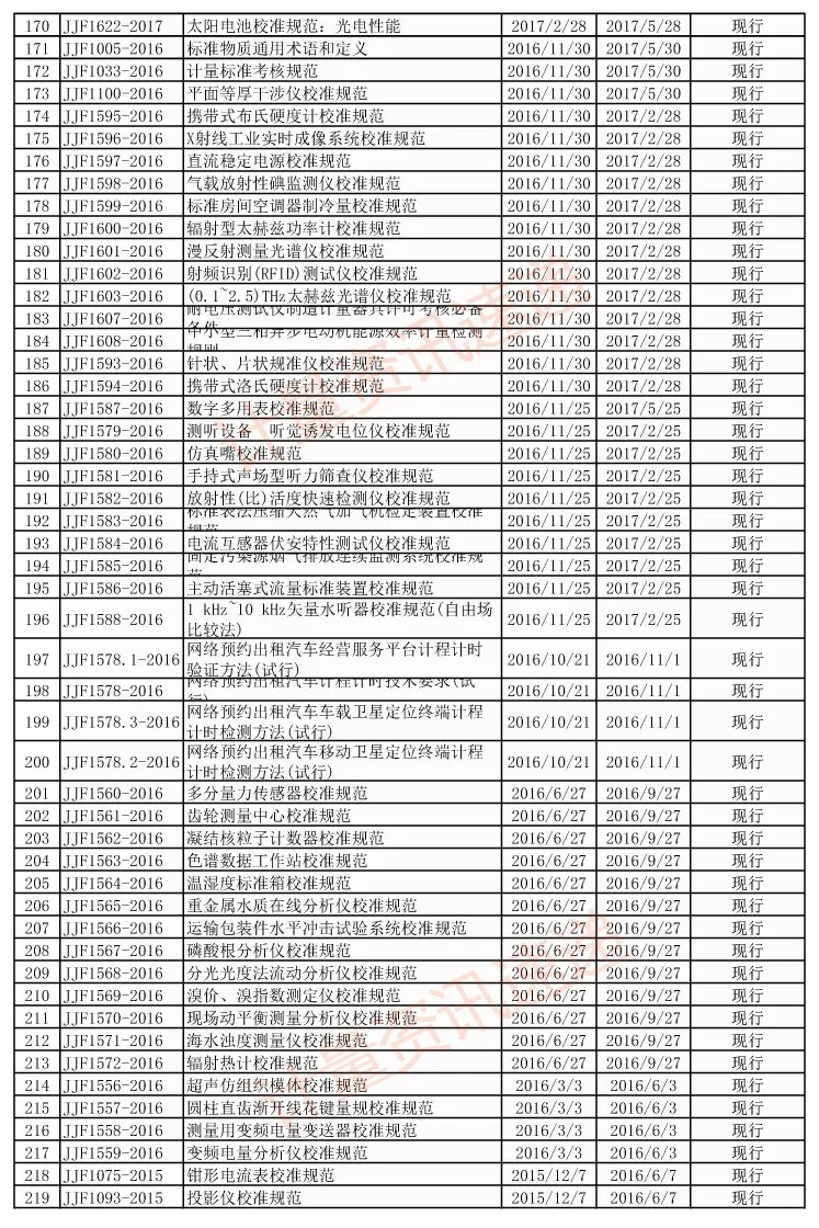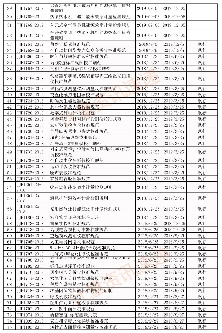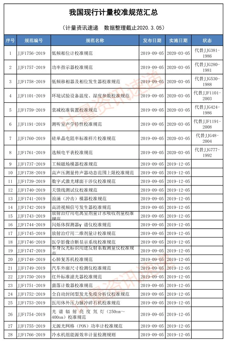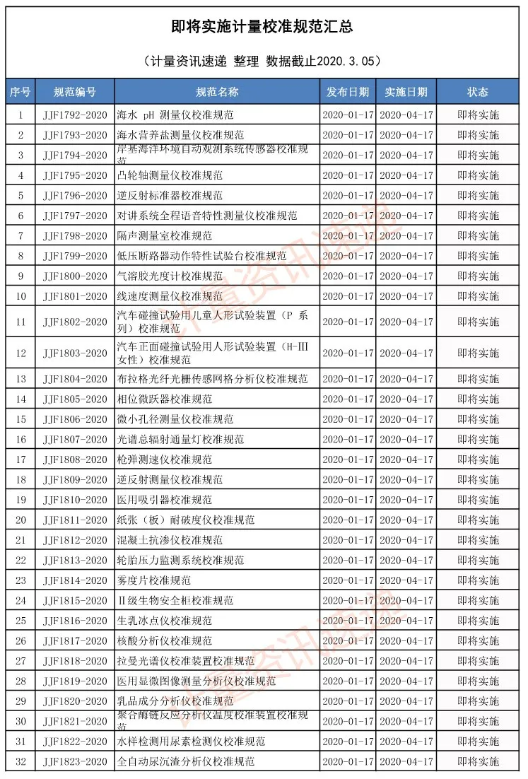 以下部分为国家市场监督管理总局已发布但尚未实施的计量校准规程汇总,52个计量校准规范将于2020年4月17日开始实施。